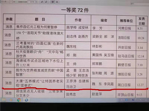 河南新聞獎(jiǎng)是經(jīng)省委、省政府批準(zhǔn)常設(shè)的省級考核評比表彰項(xiàng)目,由河南省新聞工作者協(xié)會組織,是我省新聞界的最高獎(jiǎng)項(xiàng)。每年一次的評選活動是對全省新聞宣傳工作成果的全面檢閱。今年在第三十六屆(2018年度)河南新聞獎(jiǎng)評選中,全省50余家有新聞資質(zhì)的新聞媒體參評,最終共有343件作品獲獎(jiǎng)。其中:特別獎(jiǎng)2件、一等獎(jiǎng)72件、二等獎(jiǎng)106件、三等獎(jiǎng)159件、名專欄4件。周口日報(bào)在此屆河南新聞獎(jiǎng)評選中,共有11件作品獲獎(jiǎng),其中一等獎(jiǎng)1件,二等獎(jiǎng)3件、三等獎(jiǎng)5件;另外2件作品獲得河南新聞獎(jiǎng)新聞?wù)撐莫?jiǎng)。