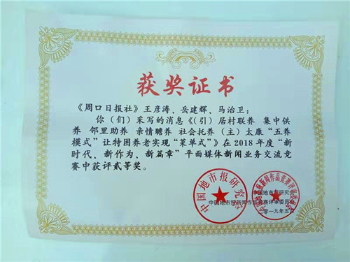 中國地市報(bào)新聞獎(jiǎng)評選活動由中國地市報(bào)研究會主辦,每年舉辦一次,在全國有著廣泛的影響,此項(xiàng)新聞獎(jiǎng)評選活動涉及全國幾乎所有地市黨報(bào),不僅是展示地市黨報(bào)形象的重要舞臺,也是衡量地市黨報(bào)辦報(bào)水平的重要標(biāo)志,同時(shí)也是以新聞的形式展示各地亮點(diǎn)工作的重要。《太康“五養(yǎng)模式”讓特困養(yǎng)老實(shí)現(xiàn)“菜單式”》稿件在此項(xiàng)新聞獎(jiǎng)評選中,同樣表現(xiàn)不凡,最終榮獲中國地市報(bào)新聞獎(jiǎng)二等獎(jiǎng)。