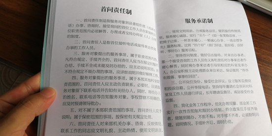 制度規(guī)定,服務(wù)對象到縣委組織部辦事、咨詢或來電時(shí),首個(gè)接待的工作人員必須熱情、禮貌、耐心接待辦理或引領(lǐng)交給相關(guān)職責(zé)科室辦理。凡符合規(guī)定,手續(xù)齊全的,限時(shí)辦結(jié),手續(xù)不全未能及時(shí)辦結(jié)的,要主動(dòng)向服務(wù)對象說明原因……縣委組織部常務(wù)副部長薛斌告訴記者:“通過扎牢制度的籠子,讓部機(jī)關(guān)工作人員做到一張笑臉迎客,一把椅子讓座,一杯茶水暖心,一顆誠心辦事,一流業(yè)績爭先的服務(wù)標(biāo)準(zhǔn),切實(shí)達(dá)到門好進(jìn)、臉好看、話好聽,事好辦的目的?!?/p>