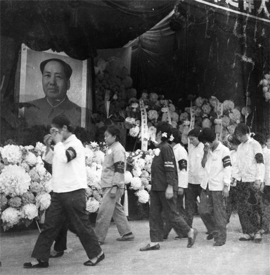 廣播喇叭一直轉播著中央人民廣播電臺的節(jié)目,哀樂一遍遍響起,回蕩在大街小巷、城鎮(zhèn)鄉(xiāng)村,大家不約而同地佩戴黑紗,自發(fā)做白花、扎花圈、寫挽聯(lián),商店里的白紙和黑布都賣缺了。機關單位的同志在自己布置起來的靈堂里悼念毛主席,學生每天上課之前都向毛主席默哀,工廠里掛起了“繼承毛主席遺志,抓革命、促生產”的橫幅,農民佩戴著黑紗在田野里勞動。