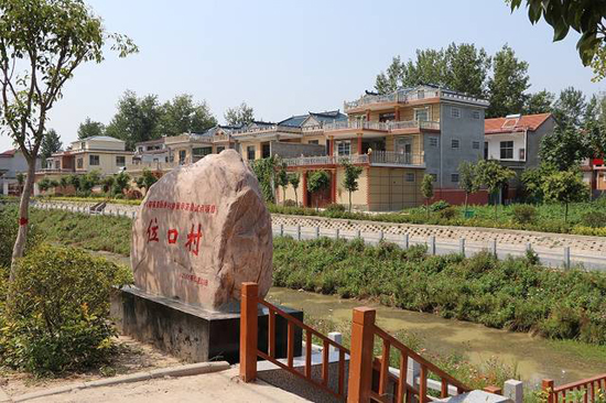 天藍水清,綠樹成蔭,九曲橋旁邊的岸上開滿了格?;ǎ粫r有水鳥從水面掠過,這不是某個大城市的濕地公園。這是位口村的“水上公園,”如今已經(jīng)成了村里的標(biāo)志性建筑。夜幕降臨,村民們?nèi)齼蓛删墼诤舆吷⒉?、乘涼?!庇腥司幜诵∏焊裆;▋合蜿栭_,歡迎您到位口來;扶貧攻堅結(jié)碩果,村民感恩黨關(guān)懷……