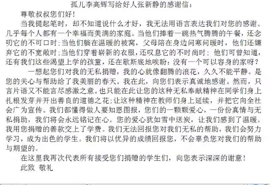 為表示對張新靜等人大代表的感謝,隨后,李高輝給張新靜寫了一封感謝信。信中,他表示,自己一定不辜負(fù)大家的期望,以后會(huì)更加努力學(xué)習(xí),回饋社會(huì),回報(bào)大家?!八且粋€(gè)懂得感恩的孩子,讀了他的來信,我感到很欣慰?!睆埿蚂o說。