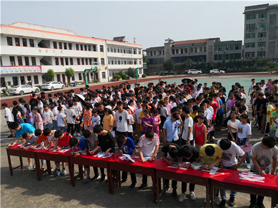 7月2日,沼山中學師生齊聚學校操場,舉行“小手拉大手 同創(chuàng)文明城”活動啟動儀式?;顒蝇F(xiàn)場,同學們整齊列隊,依次上前,鄭重地在橫幅上簽上自己的名字,吹響學校新一輪創(chuàng)建攻堅號角。