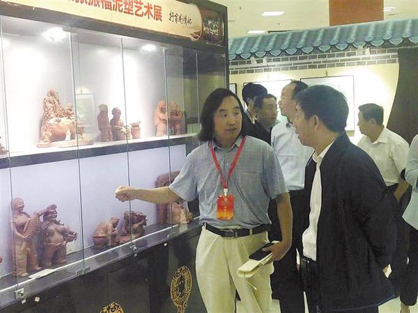 9月13日上午,2019年中國(鄭州)中秋文化節(jié)、中國農民豐收節(jié)、國慶節(jié)“三節(jié)聯(lián)動”系列傳統(tǒng)文化活動在鄭州綠博園啟動。鄲城縣泥塑藝人張振福受邀攜帶300多件泥塑作品參展,為活動帶去了濃濃的鄉(xiāng)土味兒。圖為張振福正在向參觀群眾介紹作品。
