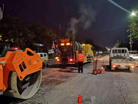 9月20日晚,記者在八一大道北段看到,道路綜合養(yǎng)護車、壓路機、運輸車、圓周切割機等車輛和設備早已到位,市政工人正在施工(如圖)。從切割路面到恢復通車,一段路不到兩個小時就完成了任務。從外觀看,新更換的窨井蓋與以前的并無明顯差別。