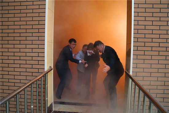 記者在現(xiàn)場(chǎng)看到,隨著消防警鈴的響起、煙霧的彌漫,來(lái)自物業(yè)公司和社區(qū)的數(shù)十名群眾彎著腰,同時(shí)用濕毛巾捂著口鼻,緊急而有序地從步梯撤出,與此同時(shí),消防隊(duì)員迅速將消防水袋和槍頭同消防栓相連接,并打開消防栓對(duì)準(zhǔn)“火勢(shì)”,一瞬間,發(fā)生在建業(yè)社區(qū)的一場(chǎng)“火災(zāi)”被及時(shí)撲滅,現(xiàn)場(chǎng)圍觀的眾人爆發(fā)出陣陣掌聲。