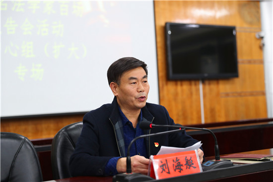 11月26日晚,太康縣在縣委綜合樓召開縣委理論學(xué)習(xí)中心組(擴大)“不忘初心、牢記使命”主題教育夜校法治宣講活動專場報告會。河南工業(yè)大學(xué)法學(xué)院教授、博士生導(dǎo)師譚波作《依法治縣與法治太康建設(shè)》專題講座??h委副書記、縣委政法委書記劉海艇主持會議。縣副處級以上領(lǐng)導(dǎo)干部,縣直各單位黨政正職,縣委各部委辦副職,各鄉(xiāng)鎮(zhèn)鄉(xiāng)鎮(zhèn)長,人大、政協(xié)機關(guān)各委室主任、副主任共100余人參加會議。
