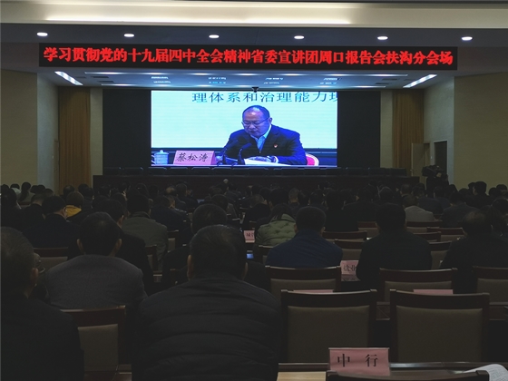 根據(jù)省委統(tǒng)一部署,11月27日,學(xué)習(xí)貫徹黨的十九屆四中全會精神省委宣講團(tuán)報(bào)告會在周口市舉行,扶溝縣四個(gè)班子領(lǐng)導(dǎo)和縣直各單位負(fù)責(zé)人在扶溝分會場聆聽宣講報(bào)告。