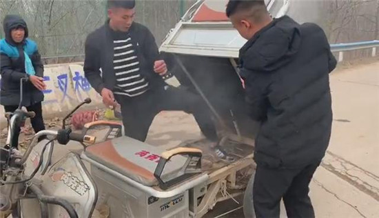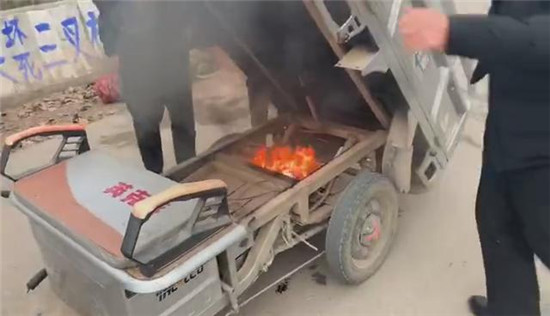 “當(dāng)時(shí)在我們前方的一輛電動(dòng)三輪車駕駛座下冒出黑煙,車上兩位老人察覺到危險(xiǎn)后,急忙下車,站在一旁不知所措。我們也緊跟上前。事發(fā)突然,現(xiàn)場(chǎng)沒有滅火器和可利用水源,而三輪車的火越來越大,兩位老人著急萬分,在旁邊不停地請(qǐng)求我們幫幫她們。根據(jù)經(jīng)驗(yàn),我們當(dāng)機(jī)立斷利用路邊的泥土進(jìn)行撲救,經(jīng)過幾十秒的緊張撲救,著火部位被成功撲滅?!比幌狸?duì)員回憶說三輪車是電線短路引起的電瓶著火。
