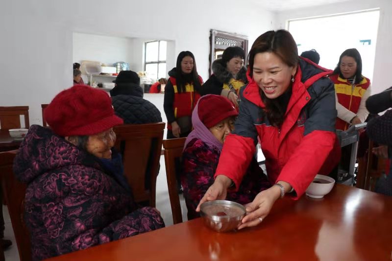 “開(kāi)飯嘍!”中午時(shí)分,志愿者們將老人一一攙扶到餐廳坐下,隨后將一碗碗香氣四溢、且冒著熱氣的八寶粥端到老人跟前?!跋悖嫦?!”80歲的黃柏功老人舀了一勺八寶粥放到嘴里品了品笑著說(shuō)。吃著八寶粥,老人想起了以前的艱苦生活,他禁不住激動(dòng)地哭了起來(lái):“以前,吃了上頓沒(méi)下頓,想吃一塊白面饃,都得等到過(guò)年。可現(xiàn)在,天天不斷肉,生活越來(lái)越好。這都是共產(chǎn)黨給咱的福啊?!?/p>