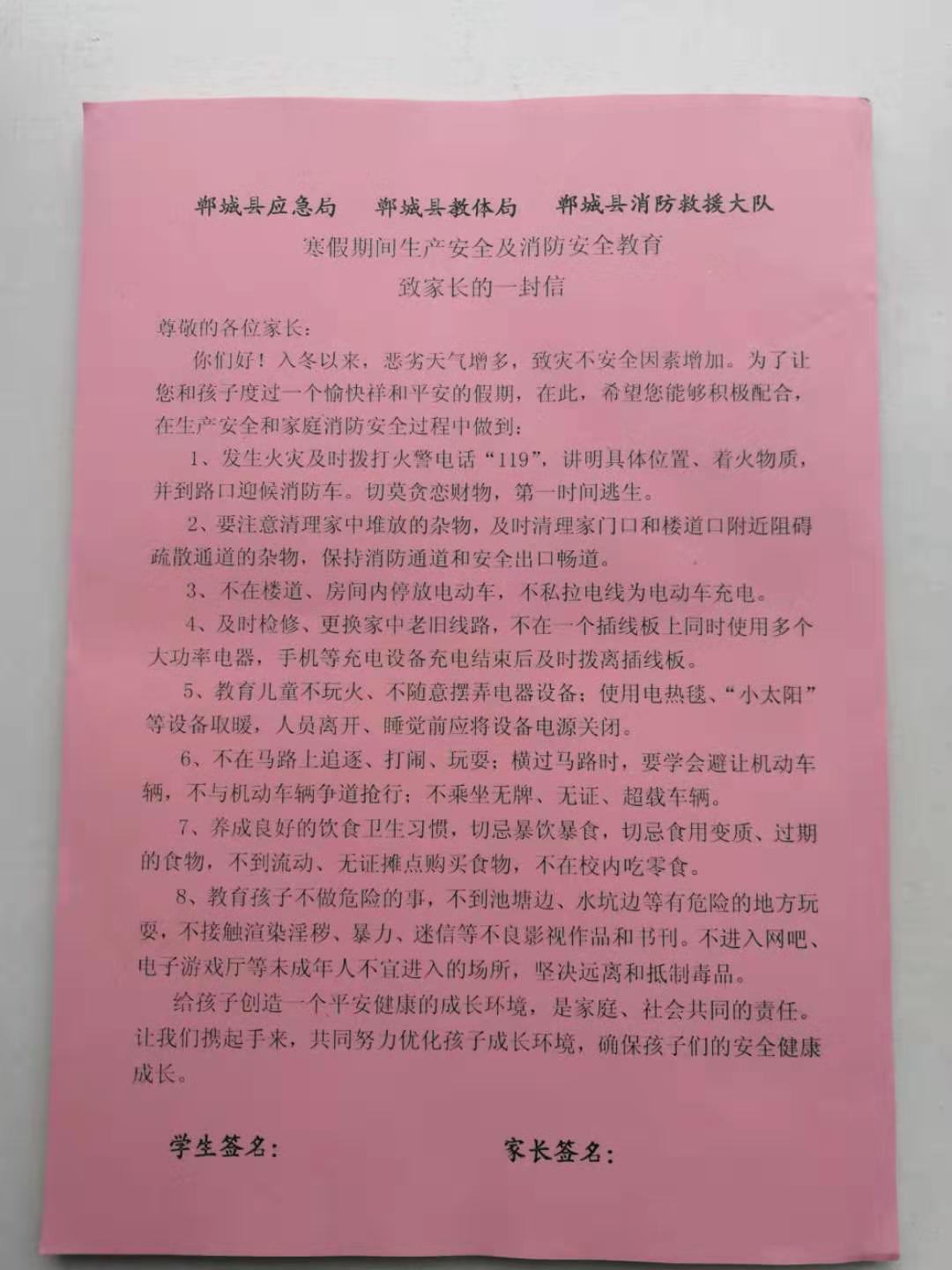 《寒假期間生產(chǎn)安全和消防安全教育致家長的一封信》包括正確報119火警、電動車充電、電熱毯使用、保持疏散通道暢通等消防安全知識以及交通安全、食品安全、網(wǎng)絡(luò)安全等,內(nèi)容豐富,有很強的針對性。鄲城縣委常委、常務(wù)副縣長王智華高度重視《一封信》的印制發(fā)放工作,專門召開會議要求縣應(yīng)急局、縣教體局、縣消防救援大隊各司其職、密切配合,縣消防救援大隊牽頭,挑選貼近生活、身邊常見的安全及消防常識,以簡潔實用、通俗易懂的語言,印制《一封信》內(nèi)容;縣教體局要迅速部署,確保在放假之前,把《一封信》發(fā)放到每名學(xué)生手中。為確保取得實效,縣教體局、縣消防救援大隊還聯(lián)合發(fā)文,要求《一封信》必須由家長和學(xué)生共同完成學(xué)習(xí),學(xué)習(xí)完畢后家長和學(xué)生還要共同簽名確認(rèn),假期結(jié)束后由學(xué)校統(tǒng)一收回報教體局存檔。