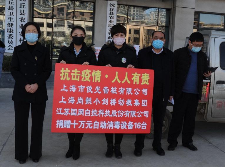 2月18日,在沈丘縣疫情防控指揮部,上海市俊光管樁有限公司、江蘇國網(wǎng)自控科技股份公司、上海上懿小劍橋教育管理有限公司聯(lián)合捐贈價(jià)值10萬元的自動消毒設(shè)備16套,沈丘縣洲業(yè)車業(yè)有限公司(洲業(yè)國際汽車城)捐贈84消毒液(10升/桶)17桶、(5升/桶)166桶,沈丘縣華順農(nóng)業(yè)建設(shè)工程有限公司捐贈75%酒精消毒液(非醫(yī)用)(2.5L/桶x6/件)168件、一次性使用醫(yī)用橡膠檢查手套(100副/盒)53盒,用于疫情防控工作??h委常委、縣政府黨組成員馬偉,縣政協(xié)副主席、縣工商聯(lián)主席張瑛,縣政府辦副主任韓向立出席捐贈儀式。