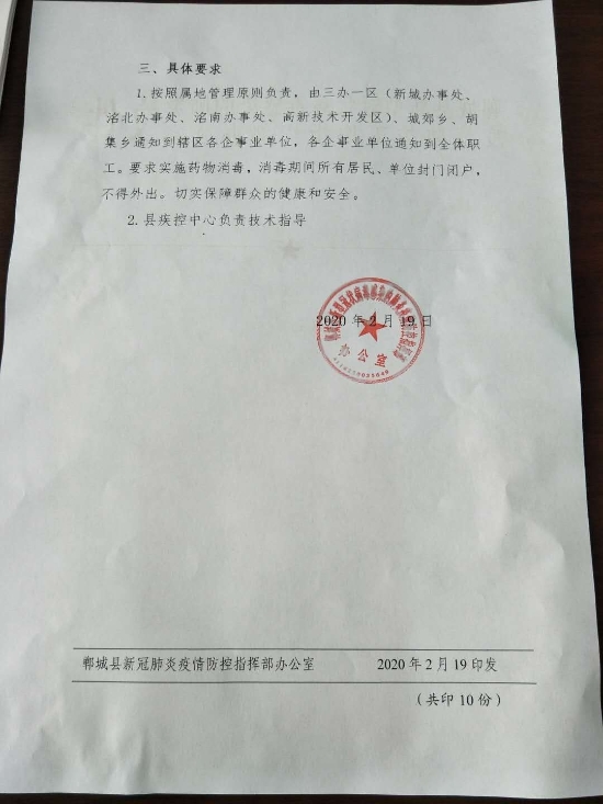 1.按照屬地管理原則負(fù)責(zé),由三辦一區(qū)(新城辦事處、洺北辦事處、洺南辦事處、高新技術(shù)開發(fā)區(qū))、城郊鄉(xiāng)、胡集鄉(xiāng)通知到轄區(qū)各企事業(yè)單位,各企事業(yè)單位通知到全體職工。要求實施藥物消毒,消毒期間所有居民、單位封門閉戶,不得外出。切實保障群眾的健康和安全。