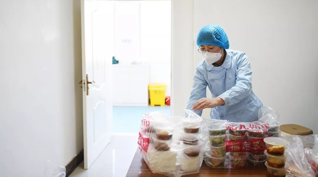 又到了打飯的時(shí)間,鄲城縣人民醫(yī)院新冠肺炎定點(diǎn)治療隔離病區(qū)護(hù)士長(zhǎng)莊坤掰著手指一個(gè)一個(gè)向餐廳介紹病人的情況,用“了如指掌”來形容最恰當(dāng)不過。一邊說話,她一邊熟練地將幾筐飯菜分類打包,每一份都用食品袋包好,哪是確診病人的,哪是留觀病人的,每一份上面都寫上名字,再由護(hù)士分別送去。
