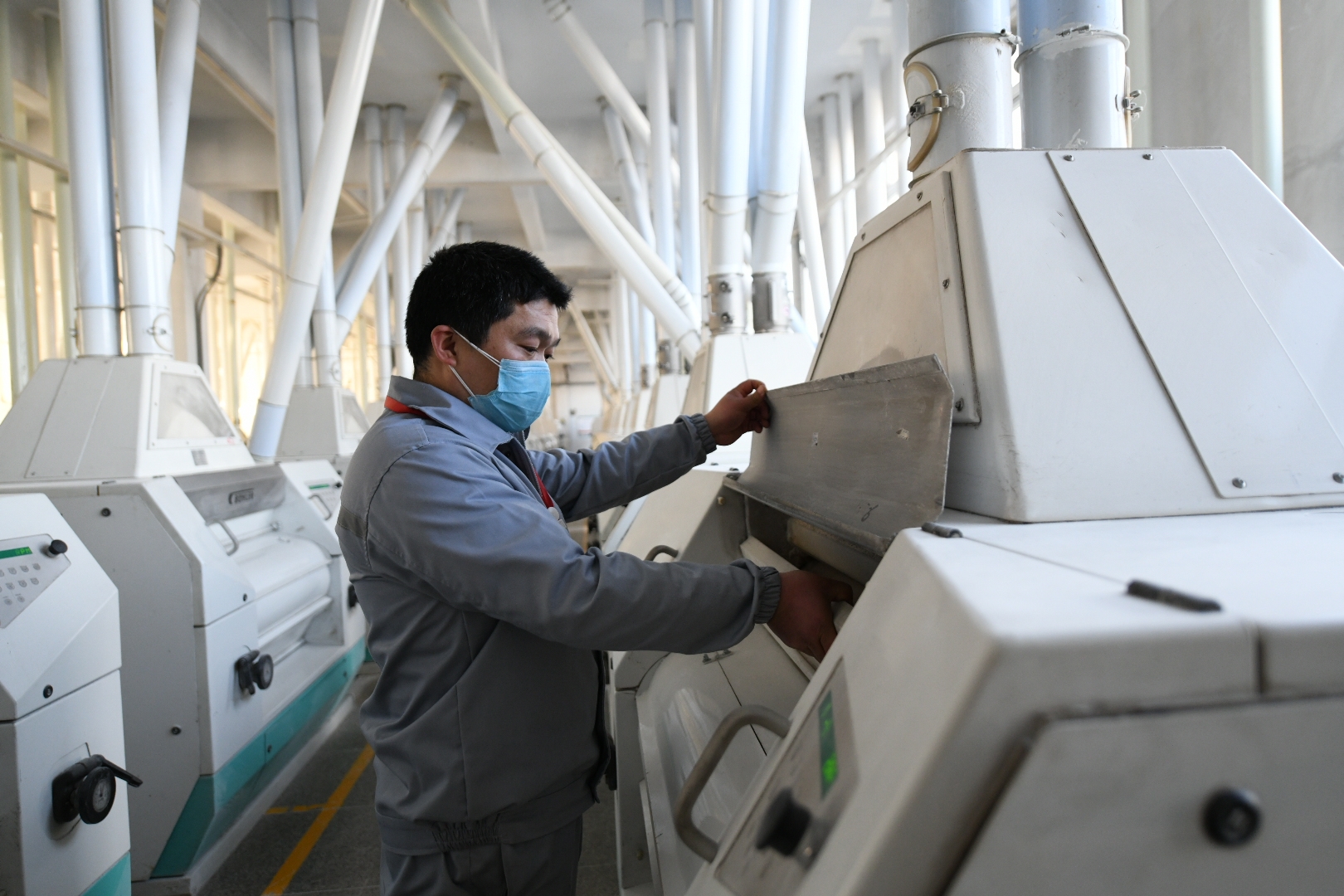 昨日,在五得利集團周口面粉有限公司的生產(chǎn)車間內,記者看到,工人們戴著口罩緊張有序地忙碌著。該企業(yè)于2月2日全面復工,目前日處理小麥3000噸、生產(chǎn)面粉2300噸。