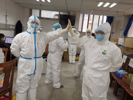 3月3日,周口市第三批援鄂醫(yī)療隊(duì)慷慨出征,這支醫(yī)療隊(duì)由周口港區(qū)醫(yī)院8位醫(yī)護(hù)人員組成,當(dāng)晚抵達(dá)武漢,經(jīng)過(guò)幾個(gè)小時(shí)的培訓(xùn),對(duì)專業(yè)防護(hù)流程進(jìn)行了優(yōu)化。第二天,周口港區(qū)醫(yī)院醫(yī)療隊(duì)正式進(jìn)駐武漢商職醫(yī)院,當(dāng)天下午開(kāi)展新冠肺炎患者的救治和護(hù)理工作。
