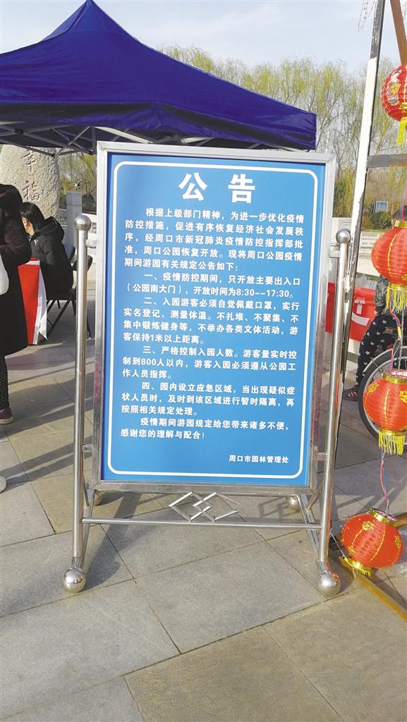 當(dāng)日上午10時(shí)許,記者在周口公園看到,在南門入口處的醒目位置,擺放著一個(gè)公告牌,寫有入園須知,上面顯示疫情防控期間的開(kāi)園時(shí)間為8:30~17:30,不少游客駐足觀看。入口處,周口市園林管理處疫情防控宣傳臺(tái)前的工作人員正忙碌著。游客需間隔1米距離排隊(duì),經(jīng)測(cè)量體溫、登記身份證號(hào)、雙手噴灑酒精后方可進(jìn)園。雖然入園程序有點(diǎn)繁瑣,但是游客都非常配合。