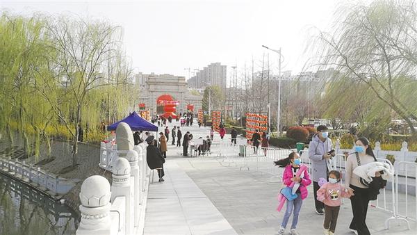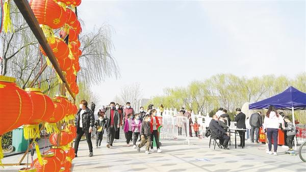 記者沿周口公園主干道向里走看到,路旁的花燈鮮艷奪目,如意湖邊楊柳依依,園內(nèi)迎春花開(kāi)、玉蘭飄香,滿園春色如期而至。記者發(fā)現(xiàn),游客們?nèi)齼蓛傻模饕约彝閱挝灰黄鹩瓮?,沒(méi)有出現(xiàn)扎堆現(xiàn)象。