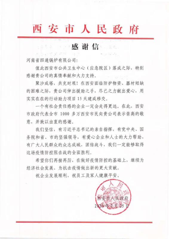 “聚沙成塔,共克時(shí)艱!在西安面臨防護(hù)物資、器材短缺的困難之際,貴公司伸出援助之手,盡己之力獻(xiàn)出愛(ài)心,在此西安市政府代表全市1000多萬(wàn)西安市民向貴公司表示由衷的感謝”。這是西安市政府對(duì)太康縣拔尖人才、河南省四通鍋爐有限公司總經(jīng)理馮坤的感謝信。一方有難,八方支援。在新聞上了解到武漢新冠肺炎疫情突發(fā)的情況后,他連夜與中國(guó)紅十字會(huì)和武漢紅十字會(huì)取得聯(lián)系,詢(xún)問(wèn)向新建的火神山醫(yī)院捐贈(zèng)醫(yī)用鍋爐和捐款事宜,通過(guò)網(wǎng)上銀行將30萬(wàn)善款轉(zhuǎn)入武漢紅十字會(huì)賬戶(hù)中。