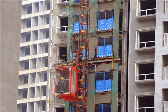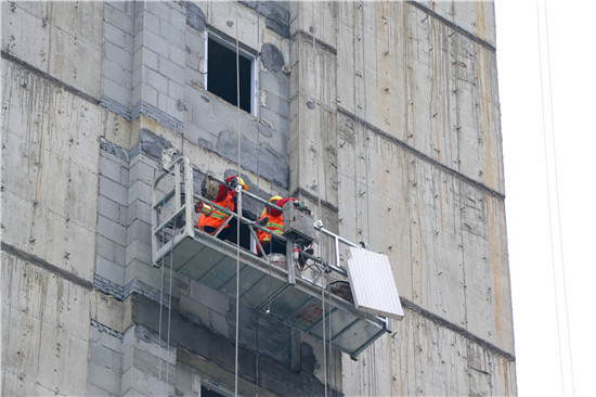 當日上午,記者在施工現(xiàn)場看到,樓體外部,工人們隨著升降吊籃的上下正在緊張有序地進行外墻保溫施工;樓體內(nèi),工人們正在進行內(nèi)墻的粉刷及水泥地板的鋪設(shè),里里外外一派忙碌的景象。