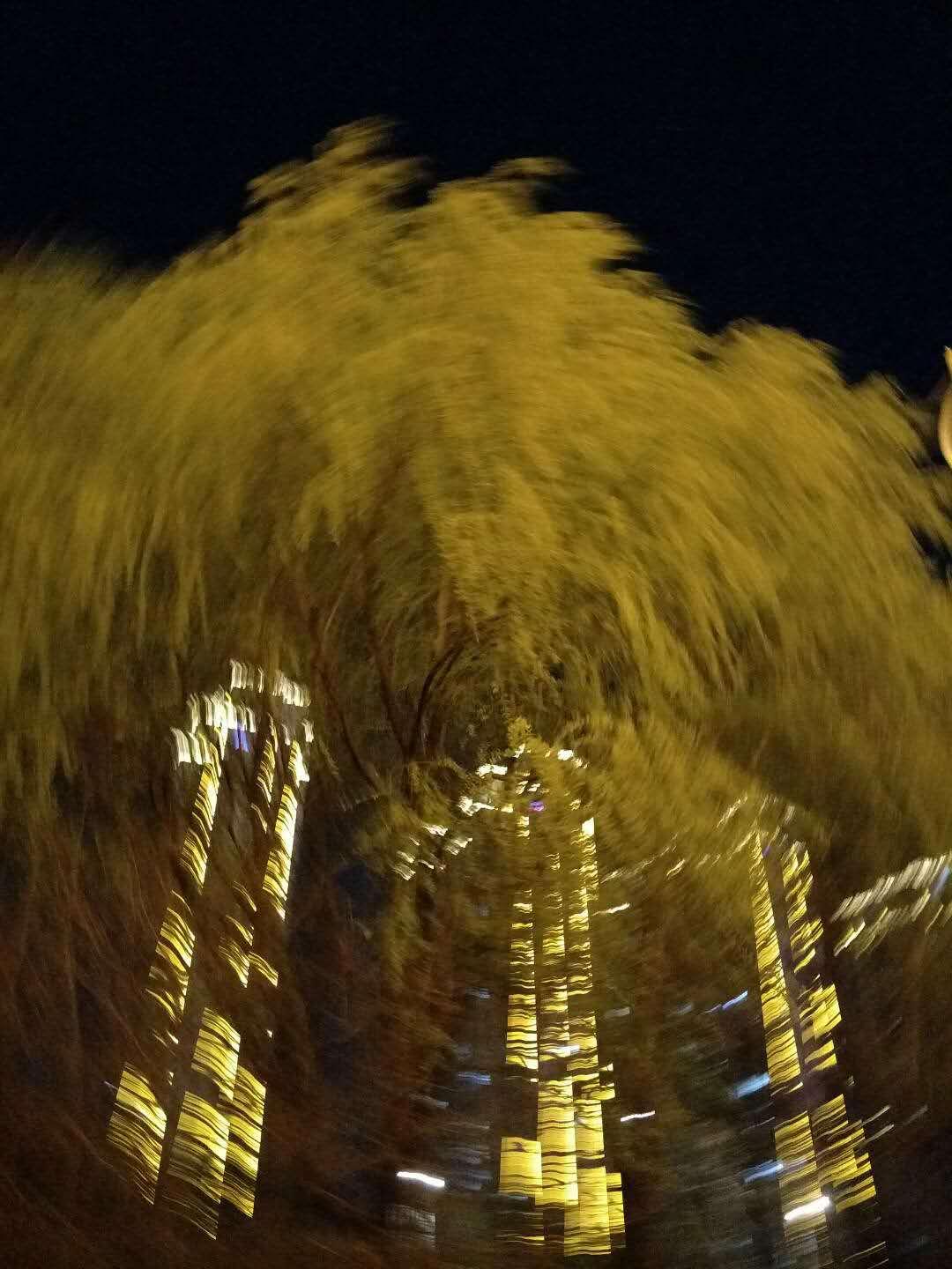 路燈照耀下的紫葉李,花兒開得繁密而明亮。