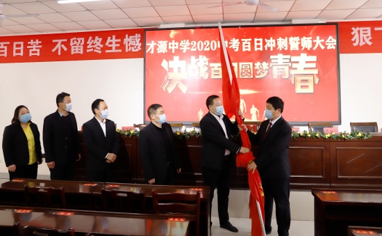 誓師大會(huì)現(xiàn)場,才源中學(xué)校長張醒民向九年級(jí)階段負(fù)責(zé)人授戰(zhàn)旗。師生代表面對直播鏡頭向全體初三師生發(fā)出鏗鏘誓言,號(hào)召大家奮勇爭雄,2020年再奪中考全市領(lǐng)先的佳績。誓詞為:凌志擎天,豪氣滿懷;天道酬勤,樂戰(zhàn)不??;意堅(jiān)心恒,信念常在;以我雄心,征戰(zhàn)未來;沖刺百日,只為無悔青春;人生綻放,定是風(fēng)雨兼程;今日苦讀書厲兵秣馬,明朝進(jìn)重點(diǎn)吐氣揚(yáng)眉。