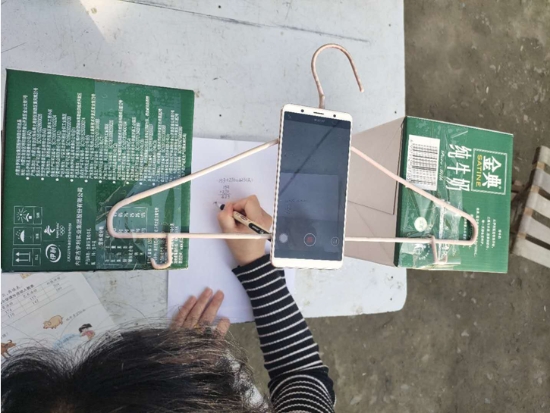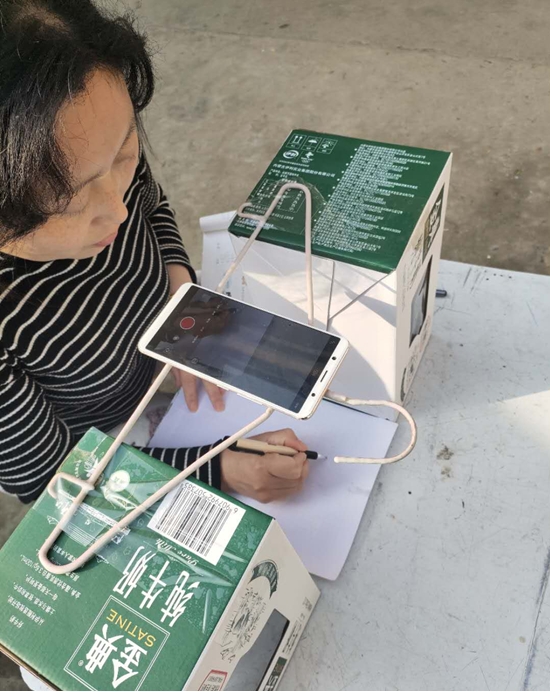 在備課時,朱霞很快遇到了難題:手機沒法固定,街上手機店又全部停業(yè),網(wǎng)上買的手機固定夾發(fā)不了貨。為了不耽誤學(xué)生上課,她想到用晾衣?lián)巍⑴D滔渥龀珊喴字Ъ?,組裝后居然效果不錯。就這樣,一個晾衣?lián)?、兩個牛奶箱和一部手機組成了她的“三尺講臺”。