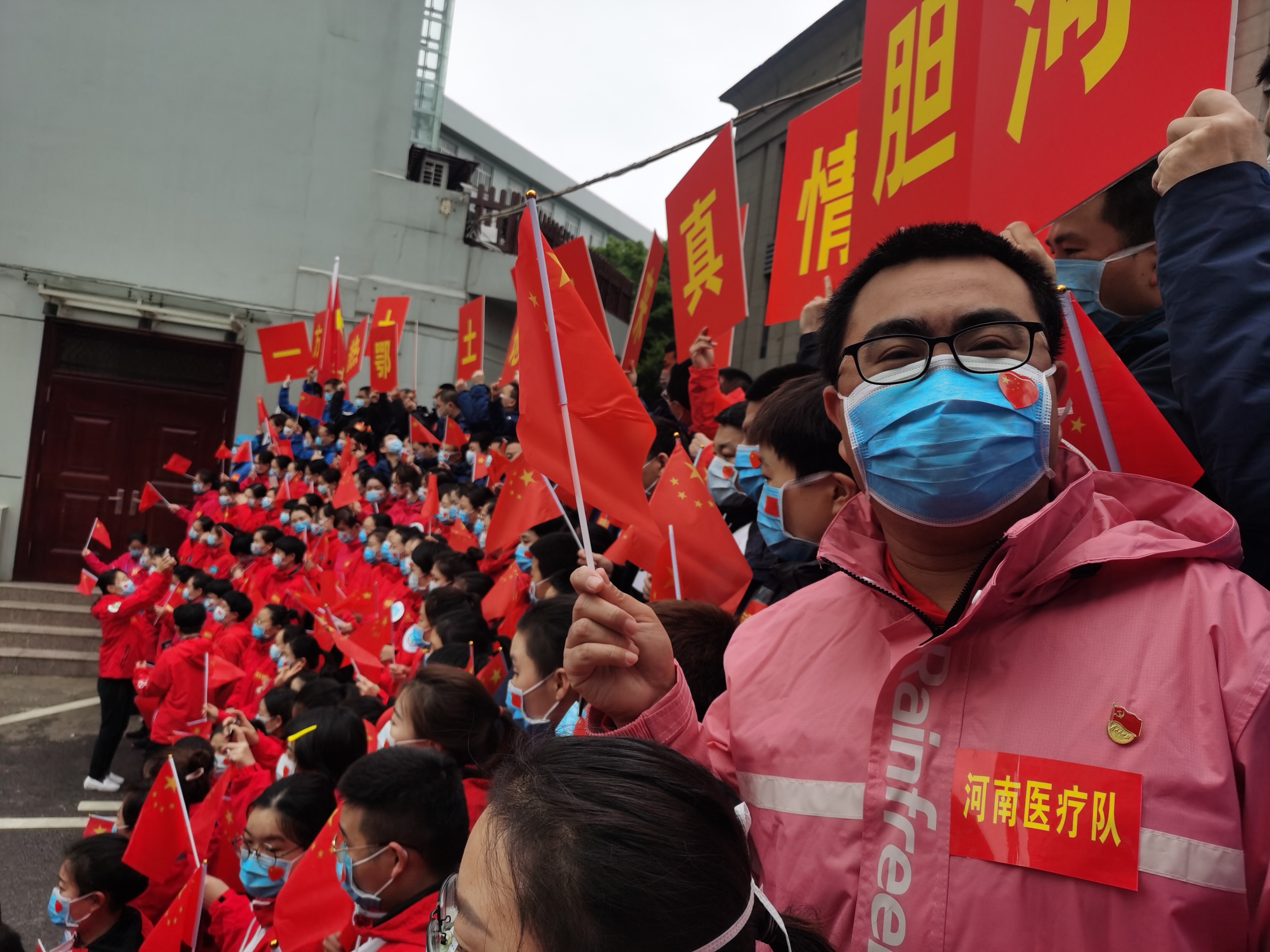 3月30日上午,湖北武漢,《歌唱祖國》響徹云霄。鄲城縣援鄂抗疫的5名醫(yī)護(hù)隊(duì)員隨河南醫(yī)護(hù)隊(duì)一道,完成使命、起程凱旋,今天下午到周口。