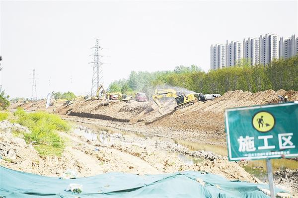4月15日上午,洼沖溝水系植物園杜樓橋施工現(xiàn)場,幾十輛工程機械車緊張作業(yè),熱火朝天的施工場景令人振奮。
