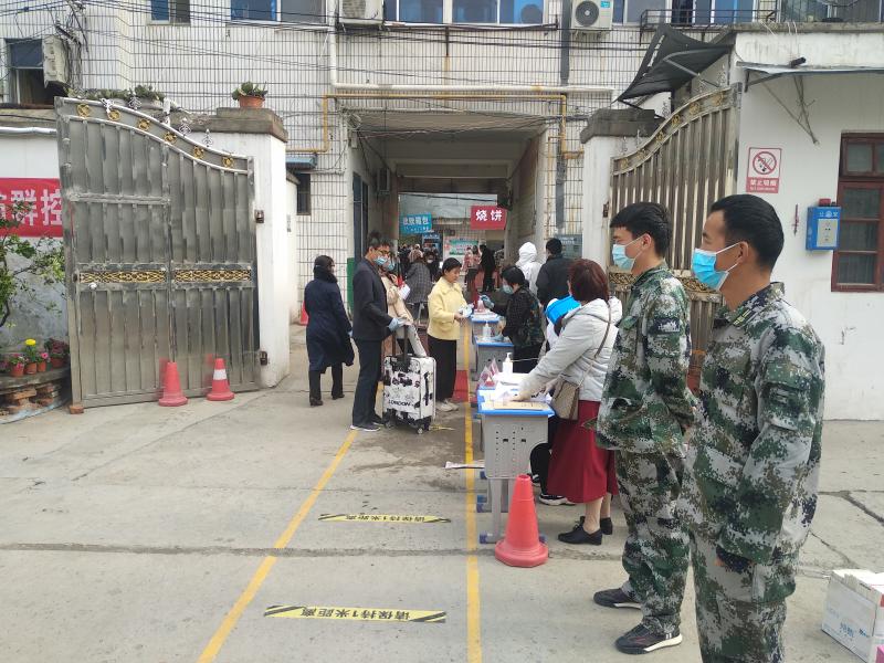“同學(xué)們,請(qǐng)排好隊(duì),與前面的人保持1米以上的距離?!?月20日上午,在鄲城縣華宇中學(xué),來自洺南街道基干民兵應(yīng)急分隊(duì)的民兵們正在現(xiàn)場維護(hù)秩序,幫助該校做好九年級(jí)學(xué)生復(fù)學(xué)入校防疫工作。