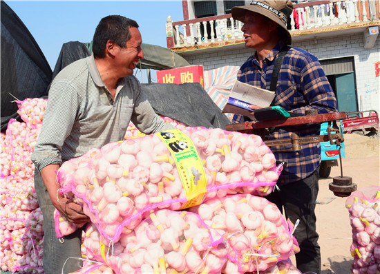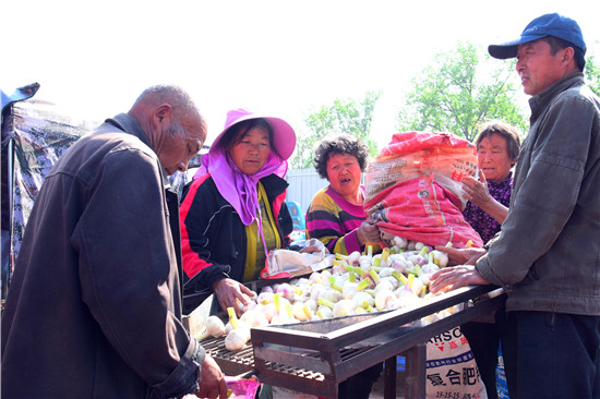4月26日下午,記者在淮陽縣王店鄉(xiāng)107國道沿線看到,各個大蒜的收購點車來車往,蒜農(nóng)們拉著新蒜賣給小販們。盡管今年春季雨水較少,天旱土地墑情較差,但是上萬畝大蒜,在蒜農(nóng)們施肥澆水管理下,長勢不錯,每畝產(chǎn)量在3000斤到4000斤之間,迎來疫情下的大蒜豐收。