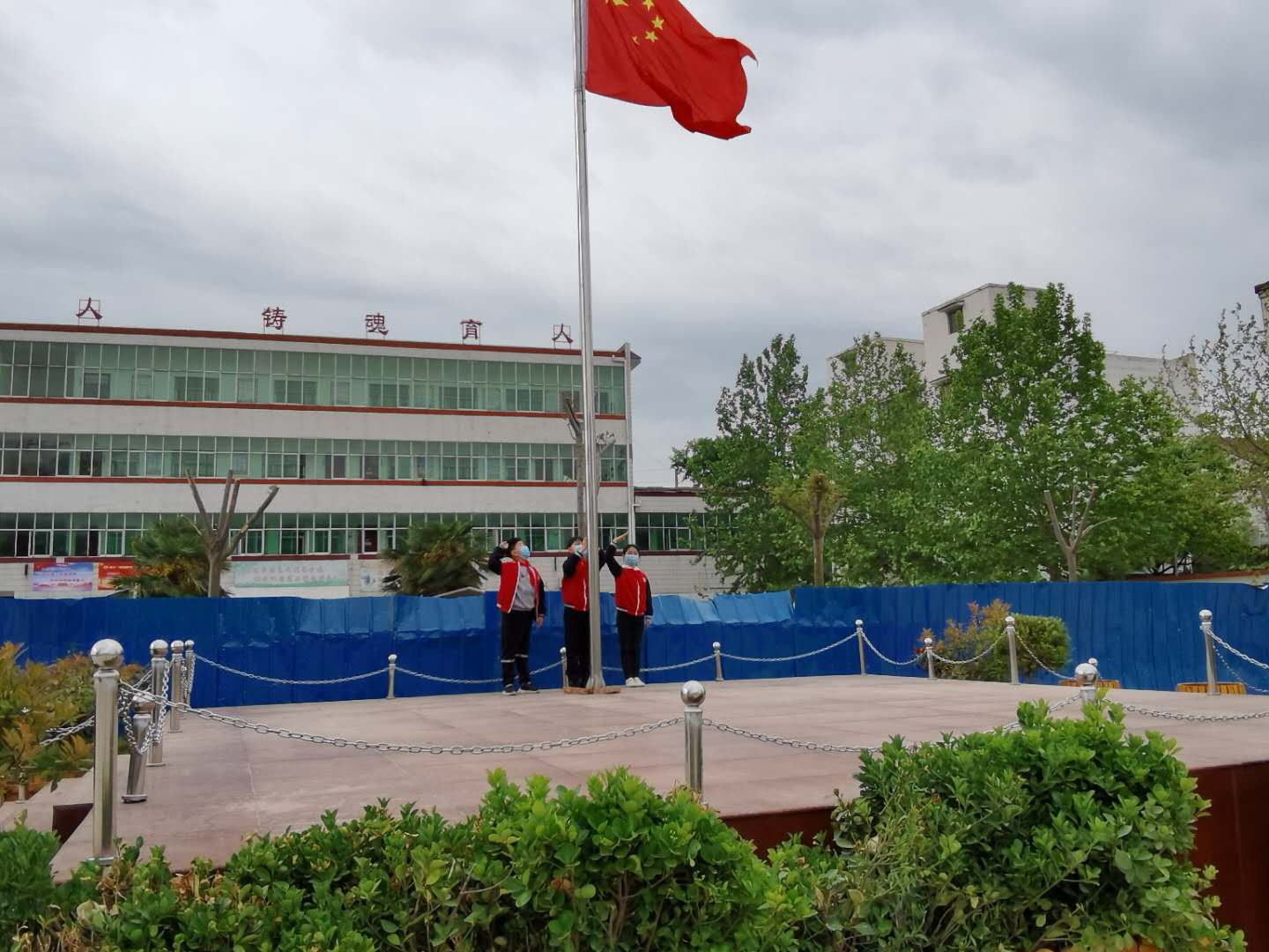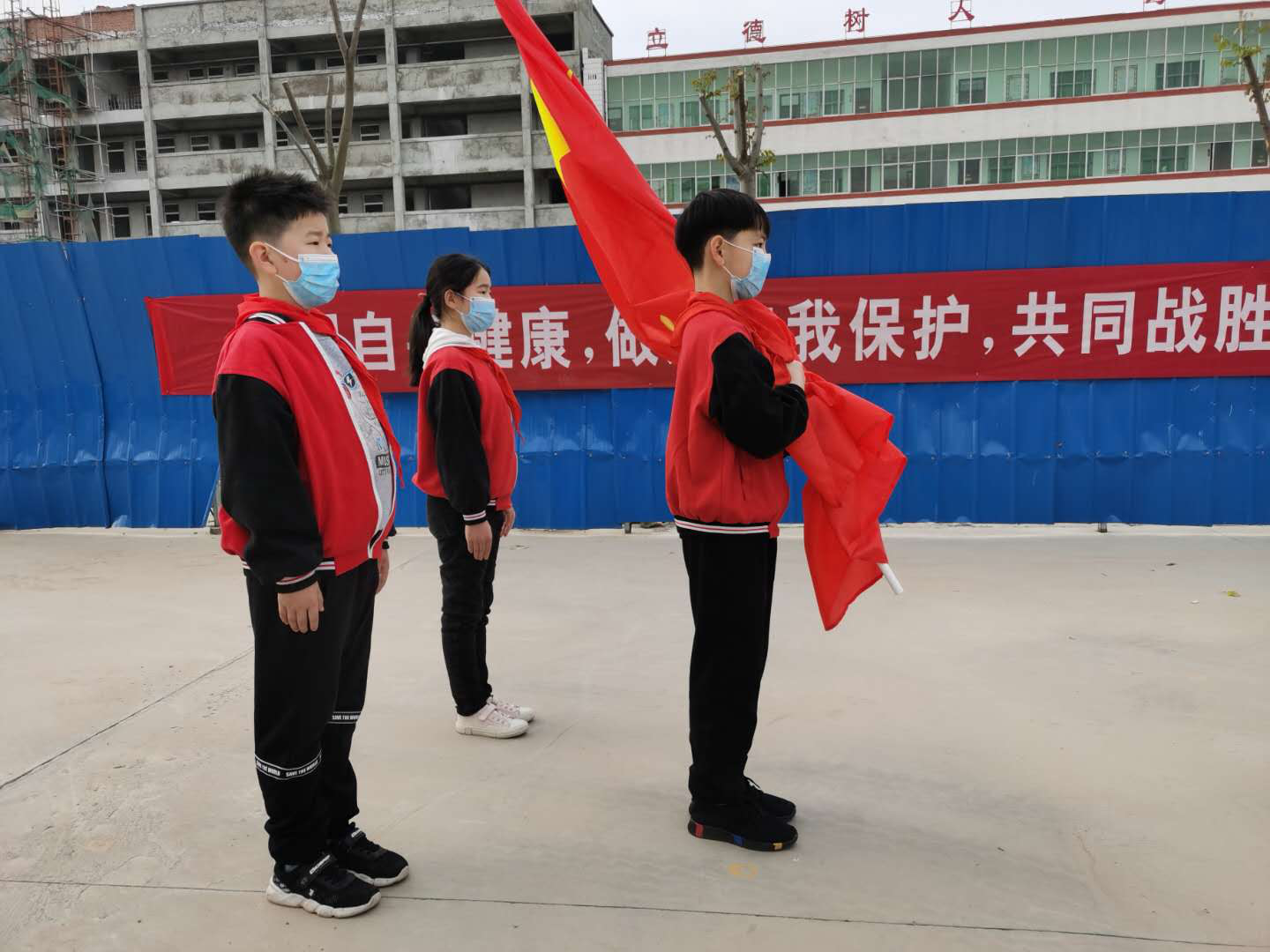 這是一次特殊的升國(guó)旗儀式,三名國(guó)旗手在操場(chǎng)上將五星紅旗冉冉升起,升旗實(shí)況同步轉(zhuǎn)播到教室內(nèi)的電視屏幕上,同學(xué)們?cè)诟髯越淌依锩嫦驀?guó)旗莊嚴(yán)肅立、齊唱國(guó)歌,面向國(guó)旗敬禮,在國(guó)旗下立下一個(gè)志,將來(lái)成為一個(gè)對(duì)社會(huì)有貢獻(xiàn)的人,能夠?yàn)樯鐣?huì)做出突出成績(jī)的人。
