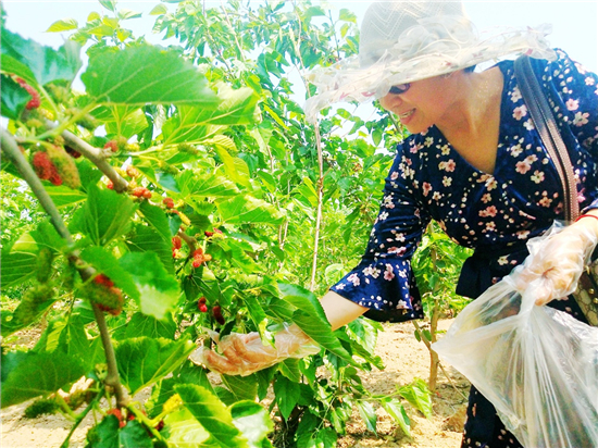 眼下正是桑葚陸續(xù)成熱的好時(shí)節(jié)。黃泛區(qū)農(nóng)場(chǎng)郭莊村鷹虎寶百畝桑椹園,一排排桑樹枝頭上,掛滿了或青或紅或紫的桑葚。紫黑桑葚放入口中,輕輕一咬,甜甜酸酸的味道瞬間在口中蔓延開來,讓人忍不住想多嘗幾顆。