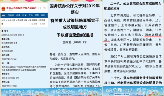 5月8日,中華人民共和國中央人民政府門戶網(wǎng)站發(fā)布《國務(wù)院辦公廳關(guān)于對2019年落實(shí)有關(guān)重大政策措施真抓實(shí)干成效明顯地方予以督查激勵(lì)的通報(bào)》國辦發(fā)〔2020〕9號文件,對213個(gè)地方予以督查激勵(lì),相應(yīng)采取30項(xiàng)獎(jiǎng)勵(lì)支持措施。其中,鄲城縣榮登“對公立醫(yī)院綜合改革成效較為明顯的地方”名錄,獲獎(jiǎng)500萬元。