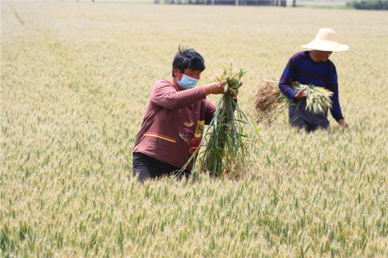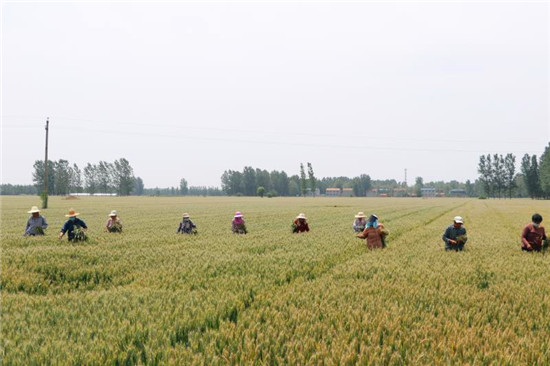 5月16日,記者在鹿邑縣棗集農(nóng)場看到,2800多畝的良種小麥繁育基地里50多人分成四支隊伍一字排開,在綠波碧浪的小麥田里認真排查、進行提質(zhì)去雜工作。