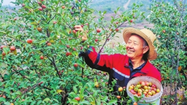 10月10日,靈寶市焦村鎮(zhèn)羅家村,位于國(guó)家4A級(jí)旅游景區(qū)娘娘山腳下的現(xiàn)代矮砧蘋果園里,去掉紙袋的紅蘋果綴滿枝頭,正曬著日光,散發(fā)出淡淡清香。