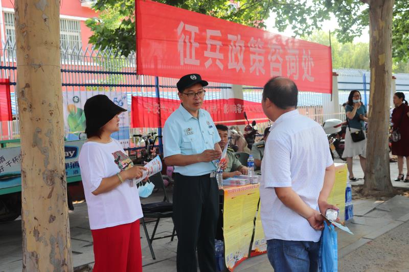 在該縣各標(biāo)準(zhǔn)化高考考點(diǎn)征兵宣傳現(xiàn)場(chǎng),人頭攢動(dòng)、熱鬧非凡?!昂媚袃海瑏懋?dāng)兵”大紅條幅和“把忠心獻(xiàn)給祖國(guó),把青春獻(xiàn)給軍營(yíng)”“參軍報(bào)國(guó)盡義務(wù),熱血青年競(jìng)風(fēng)采”的大型宣傳牌格外引人注目,內(nèi)容豐富的征兵宣傳展板一字排開,《征兵宣傳手冊(cè)》《大學(xué)新生應(yīng)征入伍宣傳單》《征兵政策宣傳解讀手冊(cè)》等征兵宣傳資料擺放在咨詢臺(tái)上一目了然,吸引了眾多的考生和家長(zhǎng)駐足觀看,圍著咨詢臺(tái)詢問有關(guān)征兵事宜。