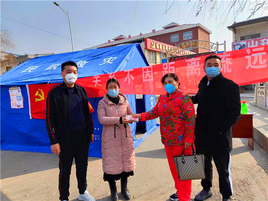 防疫物資緊缺是開展防疫工作面臨的共同難題。王七峰在防疫工作開始后,第一時(shí)間向城南辦事處捐助資金5萬元,并發(fā)動親屬積極捐款,其三哥王永紅捐助資金2萬元支持城南辦事處疫情防控工作,14歲的侄子王璽博也將自己的5000元壓歲錢捐了出來,為抗擊疫情助力。之后,王七峰除了統(tǒng)籌村里的防疫工作外,每天早上6點(diǎn),還會準(zhǔn)時(shí)到村里各個(gè)防控點(diǎn)或巡查或值守,始終堅(jiān)守在排查登記、區(qū)域防控第一線。有了王七峰的帶頭表率,該村的干部、黨員、志愿者紛紛加入抗疫隊(duì)伍中來,村民們也是有錢出錢、有力出力,大家眾志成城,有效落實(shí)了聯(lián)防聯(lián)控、群防群治的各項(xiàng)措施。