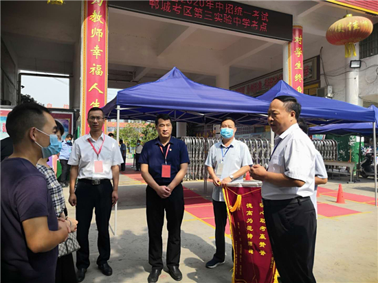 “該中招考試了,俺孩子錦博卻在7月8日騎電動(dòng)車摔斷了腿,這該咋辦,我和孩子他爸都愁壞了,沒想到我們一家在7月14號(hào)下午來(lái)第三實(shí)驗(yàn)中學(xué)看考場(chǎng)時(shí)候,第三實(shí)驗(yàn)中學(xué)考點(diǎn)主考付曄和第三實(shí)驗(yàn)中學(xué)校長(zhǎng)孟杰發(fā)現(xiàn)了我們的情況后,對(duì)我們說(shuō):“你們放心,孩子考試的事情就包在我們身上?!绷⒓窗才艑W(xué)校李蘭君老師、張子江老師專門護(hù)送孩子進(jìn)出考場(chǎng),并安撫孩子專心考試,不要有什么心理負(fù)擔(dān)。聽孩子說(shuō)這幾場(chǎng)考試,李蘭君老師和張子江老師都是背著孩子上下樓、去廁所、出考場(chǎng),對(duì)于你們的幫助,我真不知道該說(shuō)什么好,真的太感謝你們了,謝謝!謝謝!中考考生劉錦博媽媽眼含淚花動(dòng)情地說(shuō),并把一面寫著“暖心助考贏贊譽(yù),德高為范鑄師魂”的錦旗交給鄲城縣教體局黨組書記、局長(zhǎng)羅明黨手中。