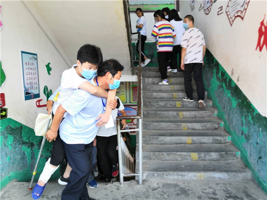 “終于到了,要不是身體好,還真不能一口氣把這孩子背上三樓?!编惓强h第三實(shí)驗(yàn)中學(xué)考務(wù)老師張子江邊擦汗邊笑著說(shuō)。