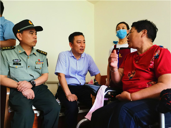 走進位于太昊路上的周口市老年護理院,院內(nèi)整潔有序、花蕊吐香鳥鳴聲聲,小徑通幽處的涼亭內(nèi)三五老人打牌、聊天,一副愜意安詳?shù)纳顖鼍啊T诤顕I(lǐng)母親王玉勤居住的房間內(nèi),李揚、孫光濤等人坐在床邊與她聊天談心,看到這么多人來慰問她,王玉勤眼中流下了感動的眼淚,她對慰問人員表示感謝,說自己來護理院近一年來,吃住條件都不錯,護理院照顧的無微不至,身體一天天恢復(fù),閑暇時還能不依賴輪椅自己走上一段路。她激動地說:“感謝黨和政府的親切關(guān)懷,我最大的愿望是希望倆兒子永遠聽黨的話,在部隊安心服役、再立新功,用優(yōu)異的成績回報黨和政府對我們?nèi)业年P(guān)愛?!?/p>