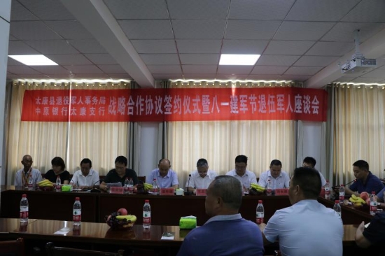 7月31日,太康縣退役軍人事務局與中原銀行太康支行舉行戰(zhàn)略合作協(xié)議簽約儀式,同時組織部分退役軍人召開了慶“八一”座談會。活動由退役軍人事務局副局長張規(guī)劃主持。