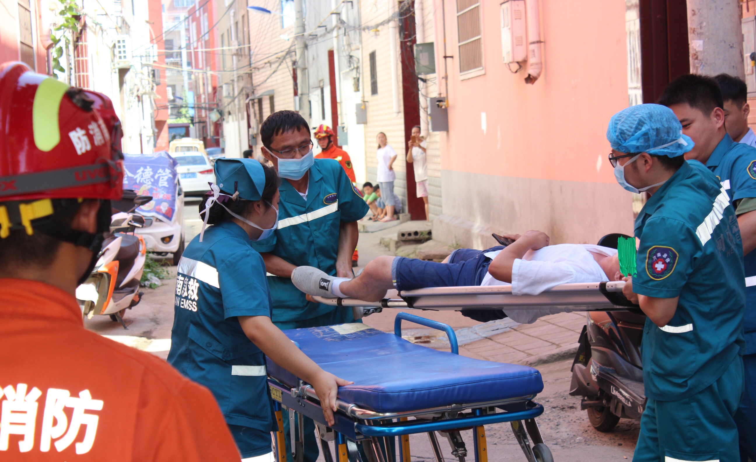 “你先喝點(diǎn)水,天太熱了,正在給你籌錢”民警在一旁勸說著,在民警與消防隊(duì)員無法靠近的情況下,安排了能靠近該女子的家屬,給體力不支的她喂水,避免因中暑而導(dǎo)致墜樓。消防官兵在此期間趁其不備,迅速將其從圍墻上救下來,同時(shí)奪下尖刀。