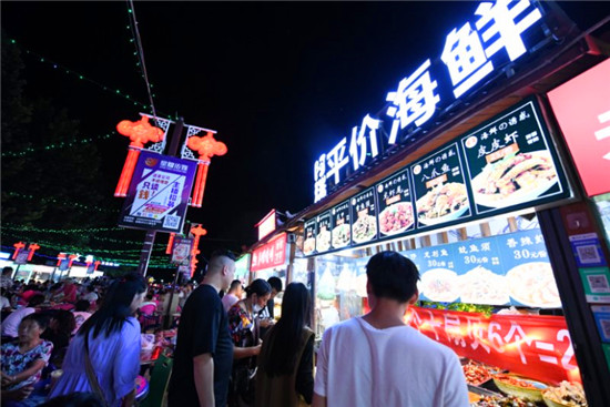 海鮮燒烤、螺螄粉、米線、拉面、刀削面、湯包蛋酒、熱干面、鴨脖子、煎扒魚、干燒鯰魚、油燜大蝦、生煎包、紅燒蝦球、豆腐花……狹窄的街道上,擺滿了簡易的各式圓桌和凳子,琳瑯滿目的各種小吃擺在敞開排列的貨架上,一目了然。顧客隨意選擇自由搭配,各種小吃讓人胃口大開。勞累之余的人們津津有味地吃著小吃,喝著飲料……