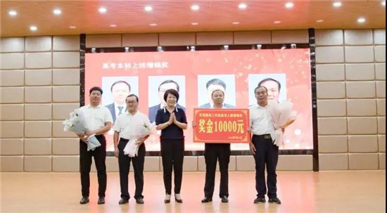 與會領(lǐng)導(dǎo)為40名本科上線增幅獎、標兵教師、新銳獎、優(yōu)秀學(xué)科組等獲獎教師代表頒獎、獻花,并合影留念。