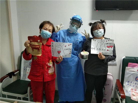面對(duì)新冠肺炎重癥病區(qū)患者心理壓力普遍較大的情況,胡奔奔每天忙完護(hù)理工作之余,主動(dòng)通過談心、跳舞、做游戲等方式對(duì)患者進(jìn)行心理疏導(dǎo),成為大家的“開心果”,使得病區(qū)氛圍大大改善,有了歡聲笑語。三八節(jié)當(dāng)天,她為病區(qū)患者送上親手繪制的“奔奔與你同在”簡筆畫,以及家鄉(xiāng)特產(chǎn)牛肉和胡辣湯,為患者加油。見到患者的笑容,成了胡奔奔最開心的事情。