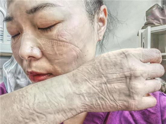 因?yàn)樾鹿诜窝椎膹?qiáng)傳染性,胡奔奔每次去病區(qū)上班都要全副武裝,而且為保證在6個(gè)小時(shí)的工作時(shí)間內(nèi)不被暴露,不能去衛(wèi)生間,不能喝水,還要穿上成人紙尿褲以防萬一。這樣下來,汗?jié)褚路浅J?,而且下班后脫掉防護(hù)裝備后,她原本清秀白皙的臉上,滿是深深的皺褶,久久難以恢復(fù),惹人心疼。給家人報(bào)平安時(shí),胡奔奔甚至不敢視頻聊天,只能語音安慰家人。
