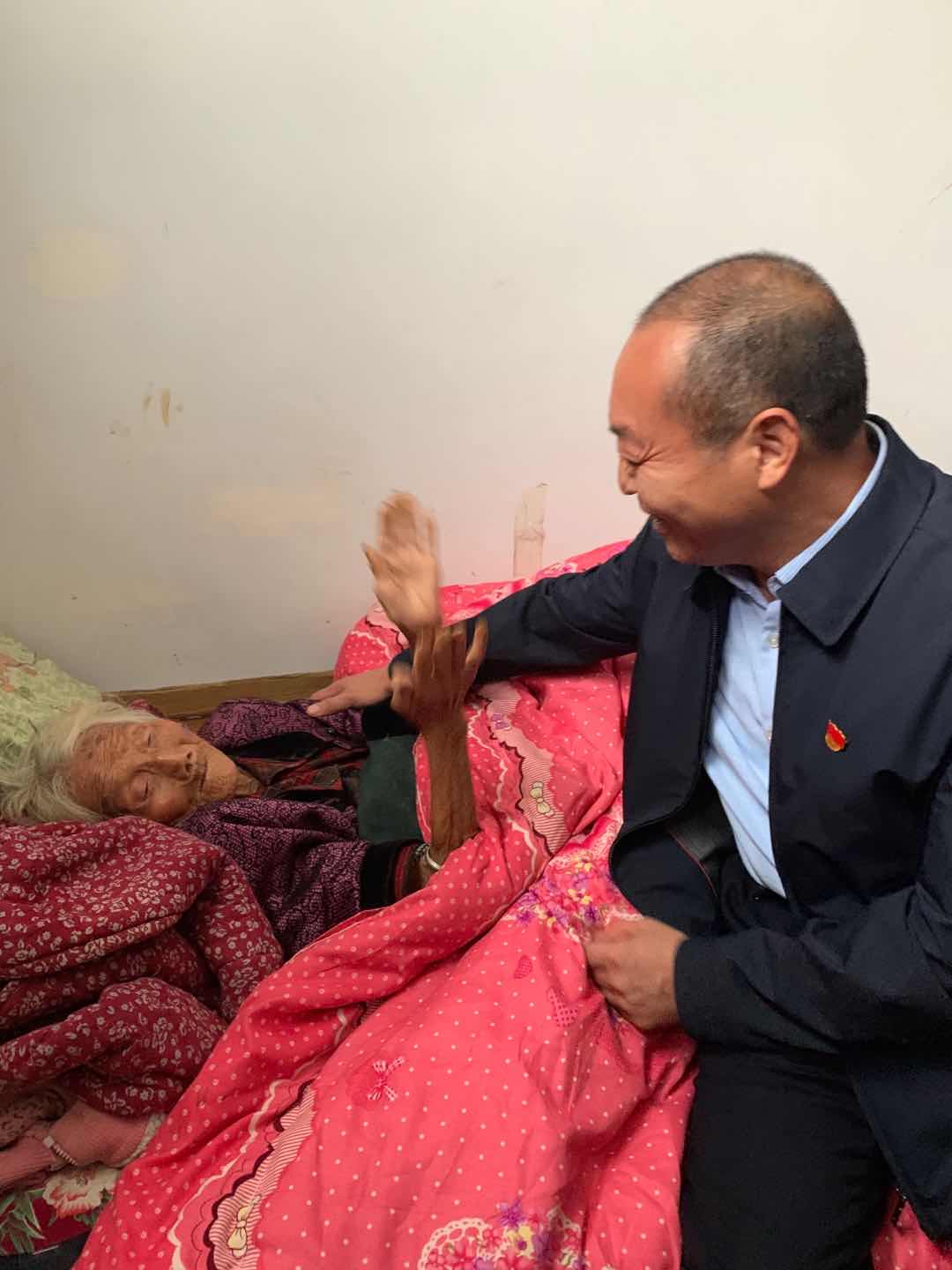這天,方凱一行帶著嶄新的棉衣、大米、食用油等禮品,首先來(lái)到磨臺(tái)村看望107歲的老人胡有蘭。躺在床上的老人雖年逾百歲,一眼看見(jiàn)方凱,就認(rèn)出來(lái)了,激動(dòng)地說(shuō):“孩子,你又來(lái)了?”說(shuō)著,就急忙拉住方凱的手,緊緊地握著??蠢先瞬环奖阕饋?lái),方凱便坐在老人身邊,笑著說(shuō):“是的。娘,兒子來(lái)看您啦!”