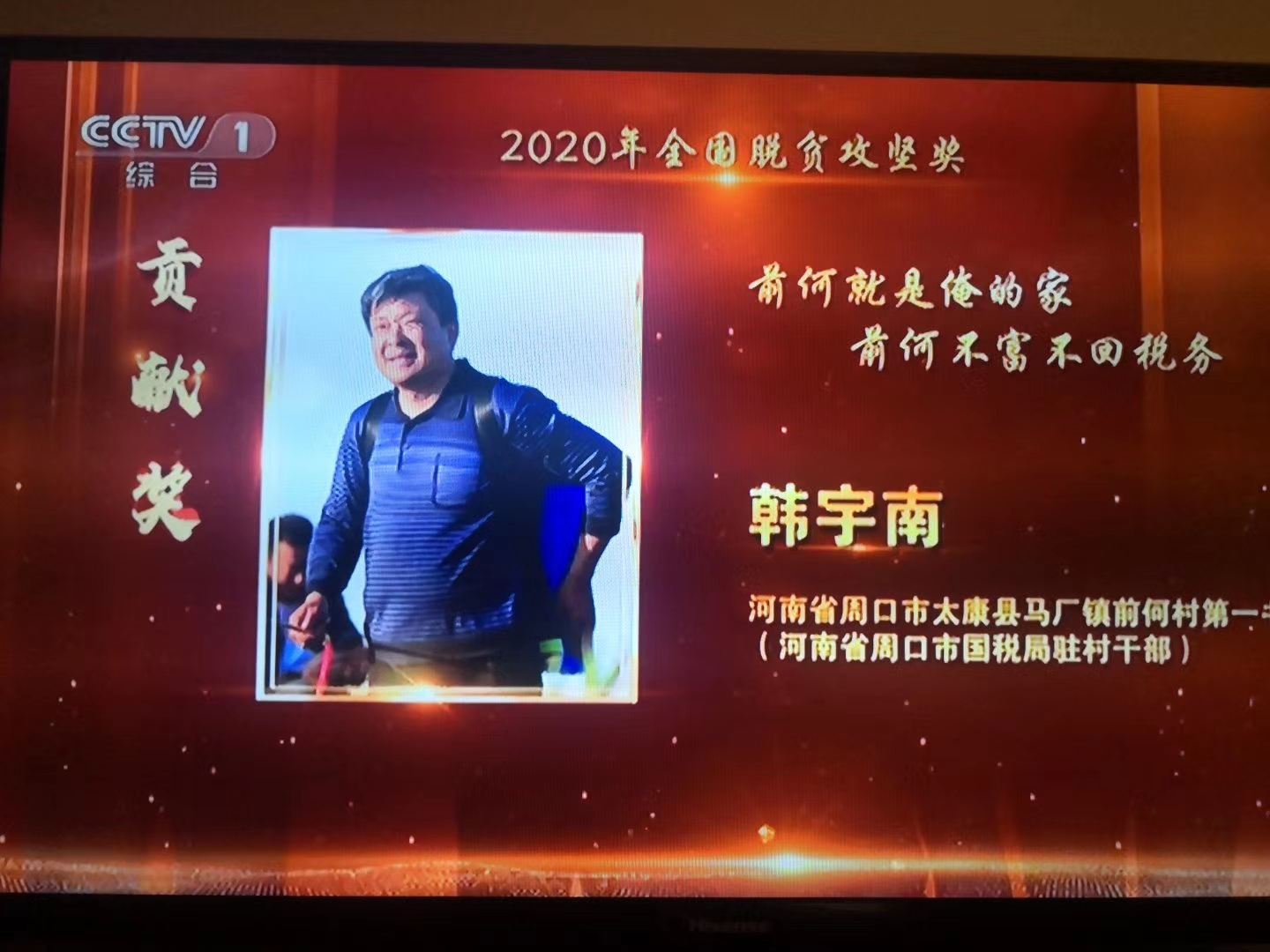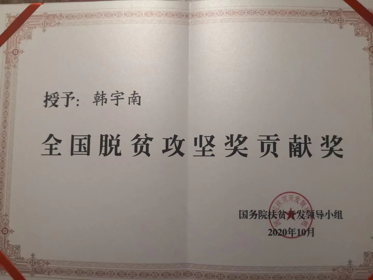10月17日,2020年全國脫貧攻堅獎表彰大會暨首場脫貧攻堅先進(jìn)事跡報告會在北京舉行。當(dāng)天,國務(wù)院扶貧開發(fā)領(lǐng)導(dǎo)小組辦公室官網(wǎng)發(fā)布了關(guān)于表彰2020年全國脫貧攻堅獎的決定,太康縣馬廠鎮(zhèn)前何村第一書記韓宇南榮獲全國脫貧攻堅貢獻(xiàn)獎。