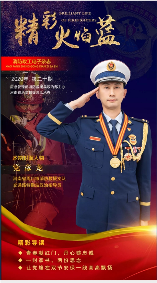 在最近一期《精彩火焰藍》電子雜志上,封面人物是來自周口消防救援支隊交通路特勤站政治指導(dǎo)員黨彥龍。該電子雜志封面人物主要介紹 “河南省最美消防人”、“河南省人民滿意的政法干警”、河南省“優(yōu)秀人民警察”等優(yōu)秀人物。